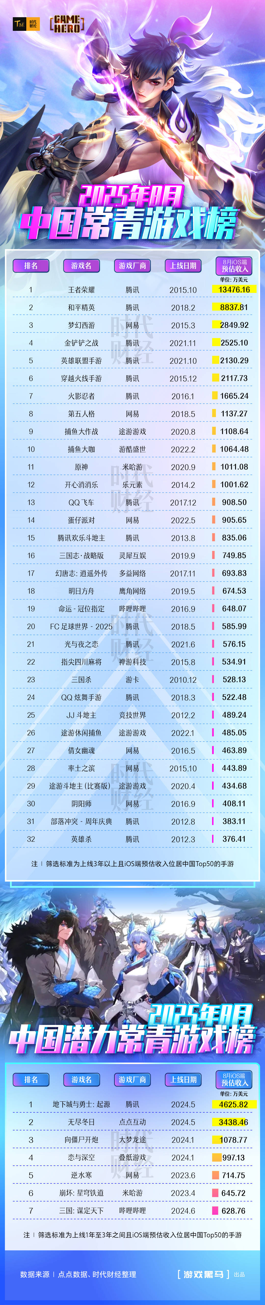 统计据,梦幻西游》等32款游戏入围《常青榜》8月份共有《王者光彩》《清静精英》《,月扩充3款数目较上;时同,《英豪杀》等老游获胜吸引玩家回流跟着《运道-冠位指定(FGO)》,《灵兽大冒险》等新游显露强劲以及《无畏合同:源能活跃》,量从7月的11款淘汰至7款8月《潜力常青榜》的游戏数。 收入跻身中国区域Top50为筛选轨范时间财经以上线年以上且iOS端预估,青游戏榜》(下称“《常青榜》”)统计并公布《2025年8月中国常;入跻身中国区域Top50为轨范同时以上线年且iOS端预估收,青游戏榜》(下称“《潜力常青榜》”)统计并公布《2025年8月中国潜力常。 财经梳理据时间,量伸长差别的是与常青游戏数,8月进一步淘汰至7款潜力常青游戏数目本年。到达1.21亿美元(约为8.66亿元)这7款游戏中国区域iOS端预估收入累计,估收入领先1000万美元此中3款游戏iOS端预。